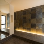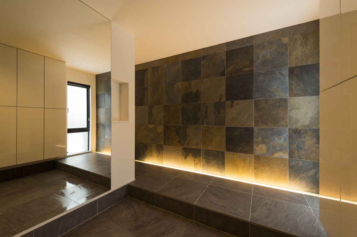③広々とした玄関ホールの壁には存在感あふれる天然石のタイルを採用