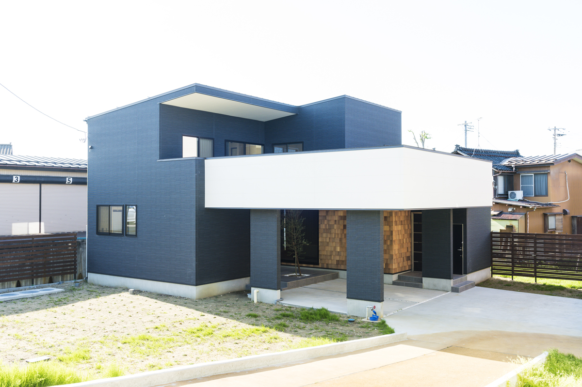 ④ゆったりとしたオープンガレージが見どころのシンプルモダンな外観デザイン