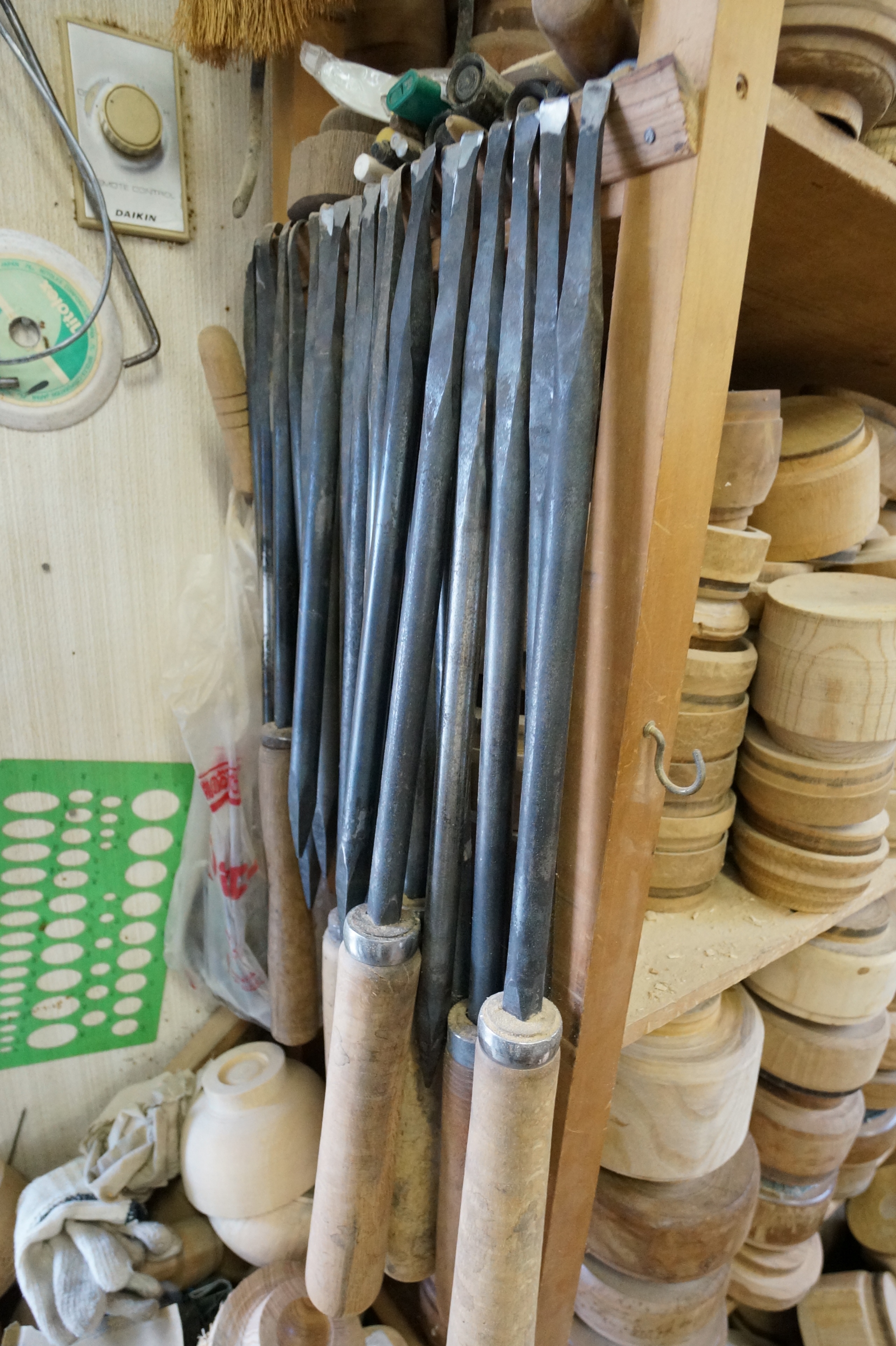 道具の鉋(カンナ)は、木地師が自ら鍛冶をしてつくったもの。独自の刃先に木地師一人ひとりの技へのこだわりが込められている。