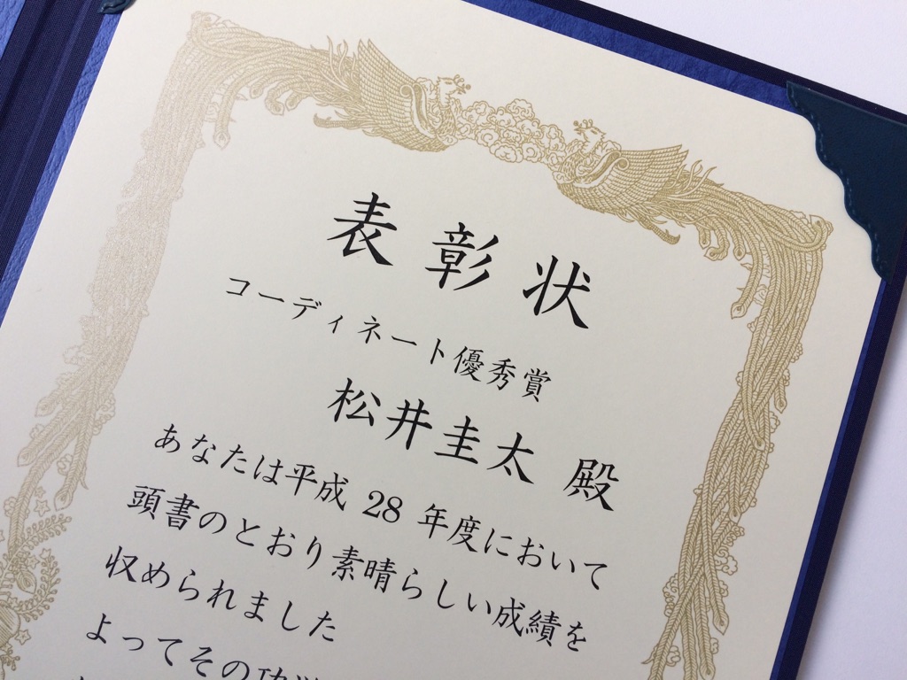 表彰状なんて大学時代ぶりで、社長からもらうとき手が・・・緊張。
