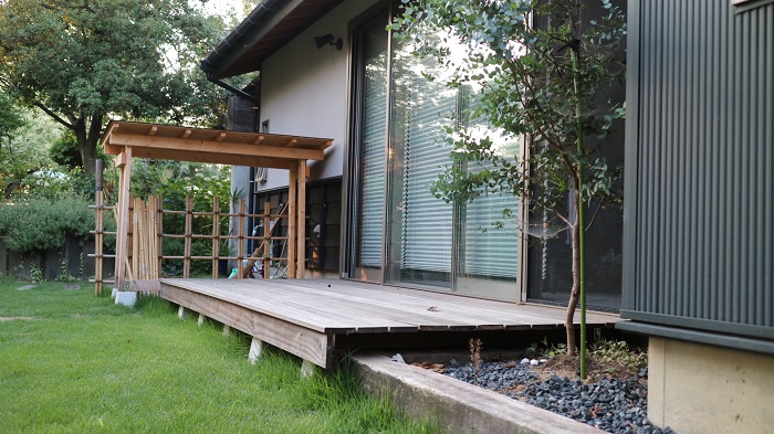 ウッドデッキに使用したのがセランガンバツ(別名バンキライ)という材木で、主に東南アジア(インドネシア・マレーシア)に生育するフタバガギ科の広葉樹です。