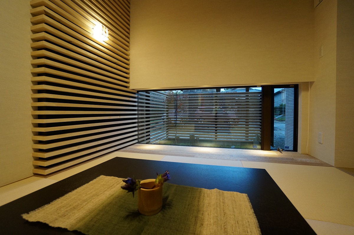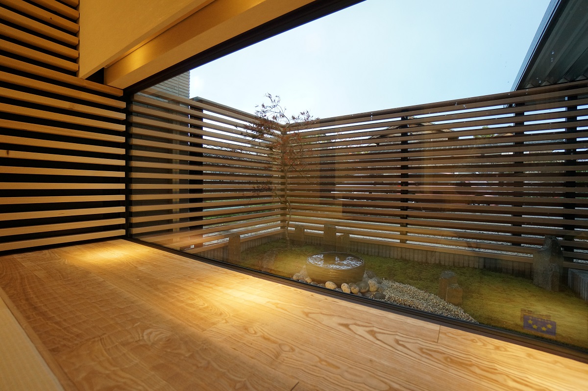 来客を配慮し、玄関ホールから すぐ 入れる和室。座の空間に合わせ ワイドな地窓から 坪庭を 楽しむことができる。