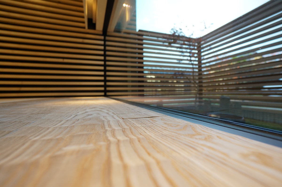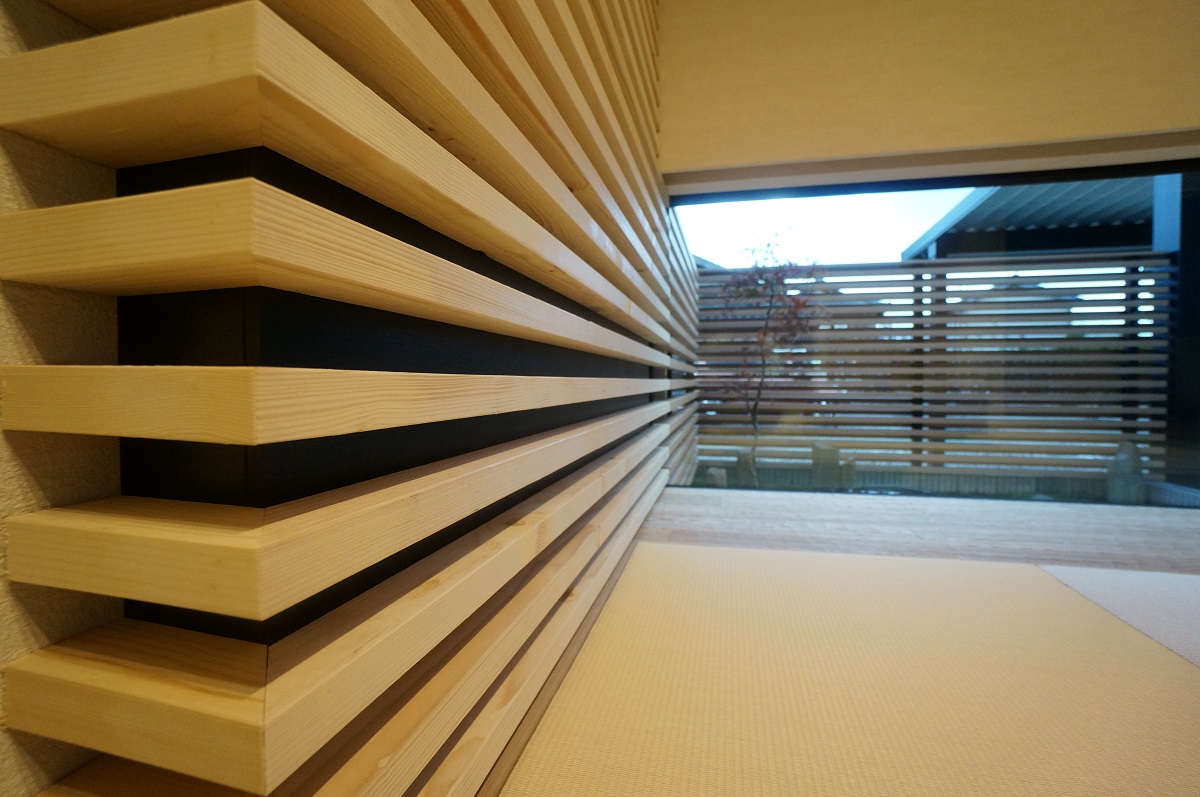 FIX窓を介して 室内の 横格子が 外部 に 連続して つながるように 組み合わせることにより、『ウチ』と 『ソト』の 一体感 が 生まれる。