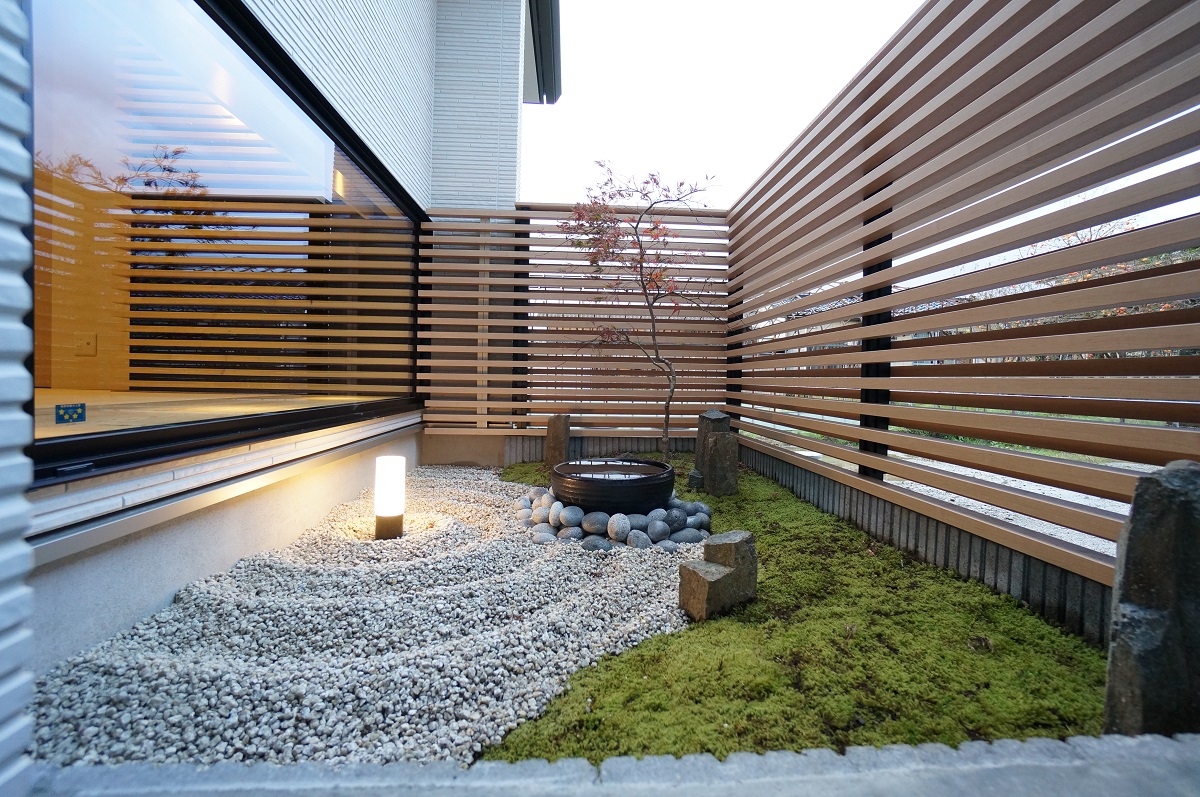 坪庭は 地元 若手庭師 庭正 長橋さんによる 提案。見る人の 和の感性を擽りながらも 洋も意識した 全体のバランスが 絶妙。