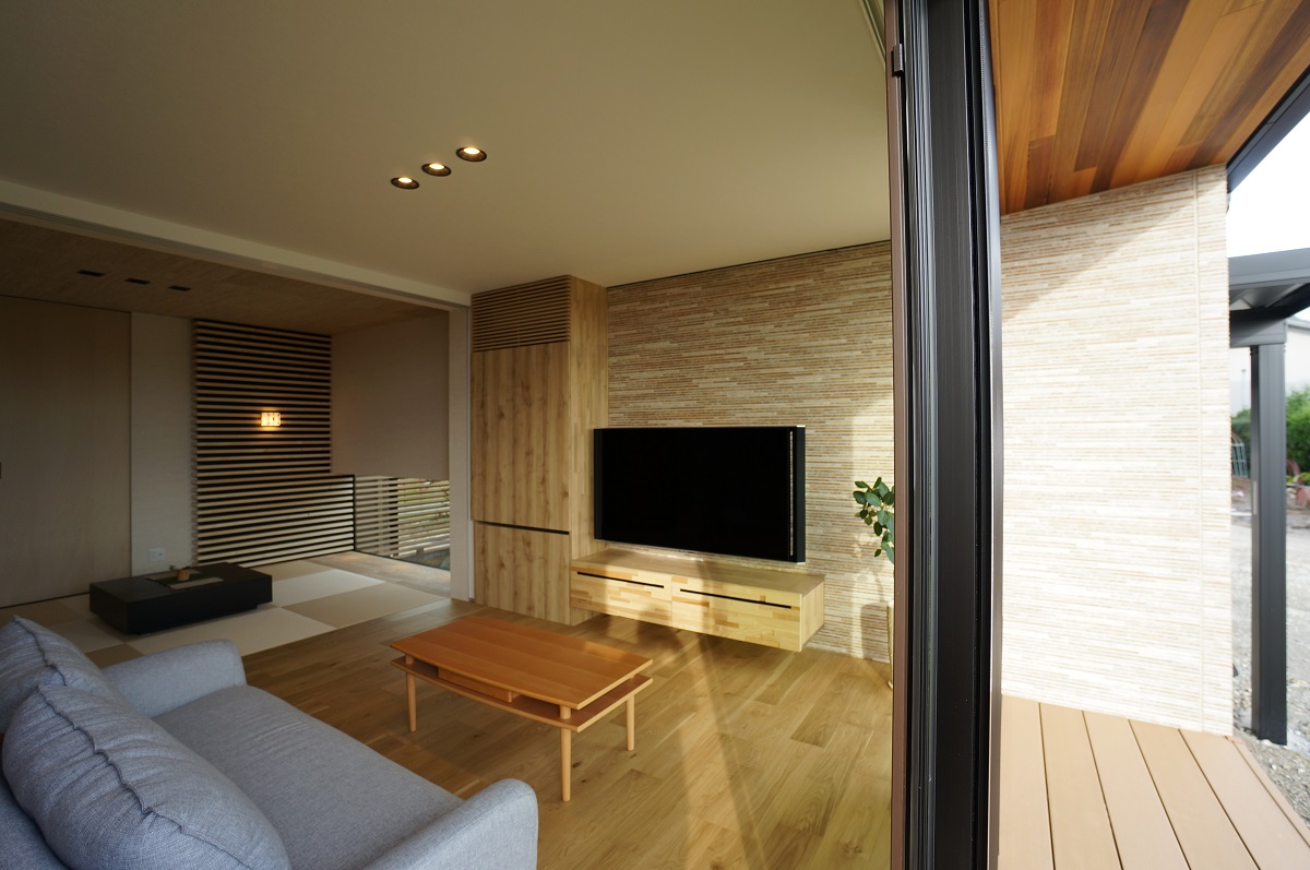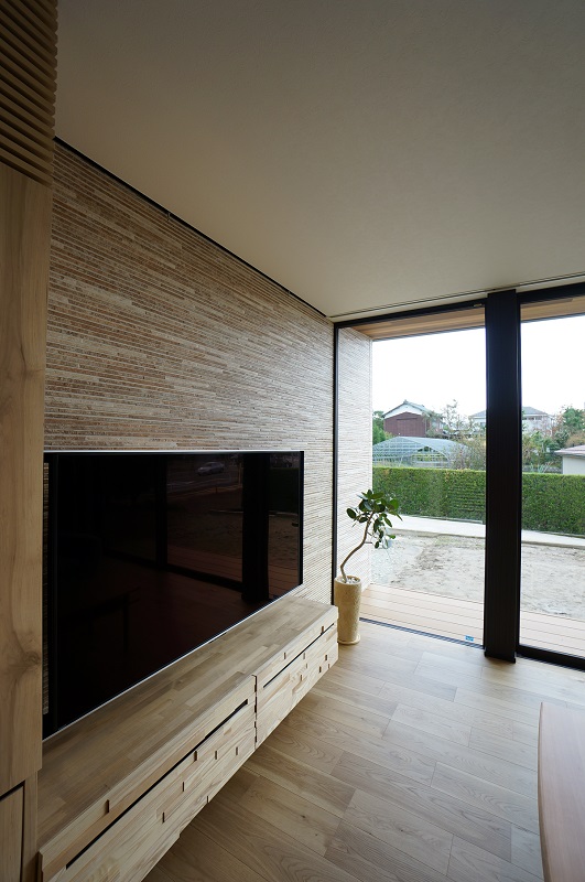 外へと つなげた壁面は、空間を より広く ワイドに 感じさせる。