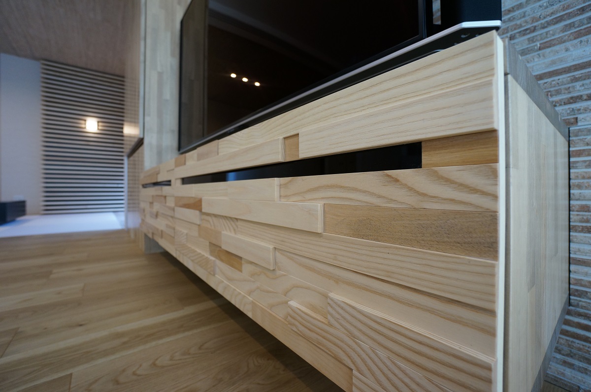 TVボードのパネルには アッシュ・カバザクラ 2種類の組み合わせ、それぞれの木目やブロックの凹凸に変化を持たせながら 素材の風合いを楽しむことができる。