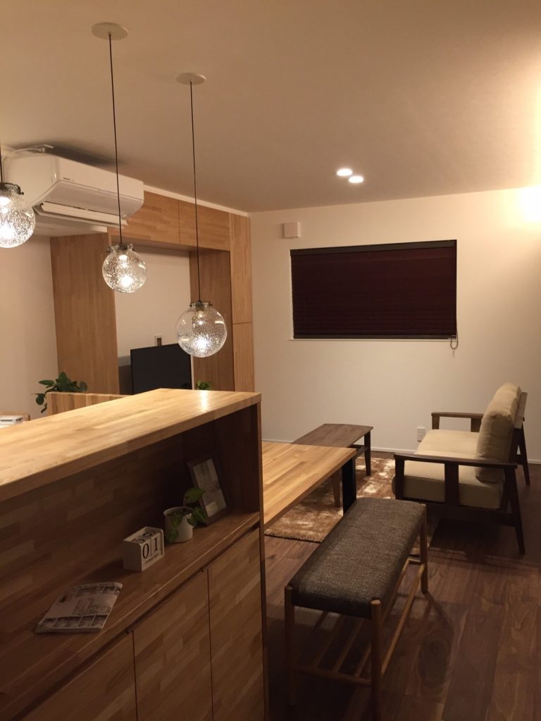 左のダウンライトの写真は、しっかりとリビングのテーブル付近まで十分な地灯りがとれています。