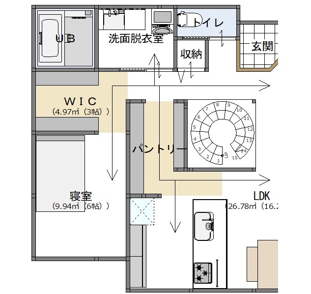 ですが、これをパントリーやW.I.Cを移動空間に組み込んで行き止まりをなくせば、両側からアクセス出来て利便性も高まり、回遊動線、裏動線にもなります。