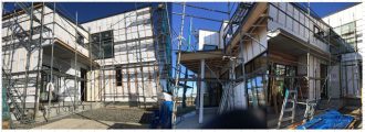 w建て方後日も晴れの中、耐震面材作業を進め、形になって来たものの。。。
