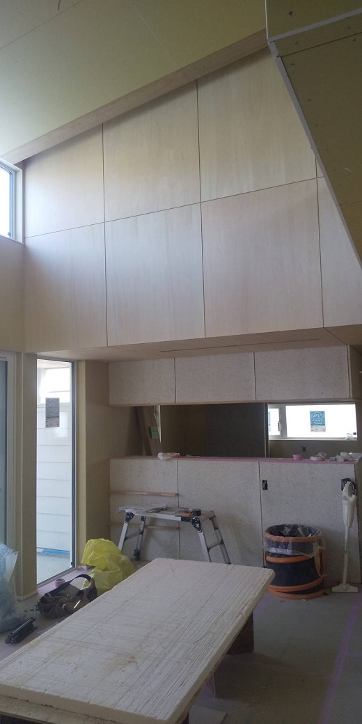 キッチンの腰壁と垂れ壁を木毛セメント板で、そこから連続して吹き抜け壁シナベニアの目透かし貼、勾配天井の両サイドには長い間接照明。