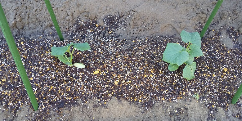 現状の砂を20センチほど堀り返してそのスペースに培養土を入れていきました。