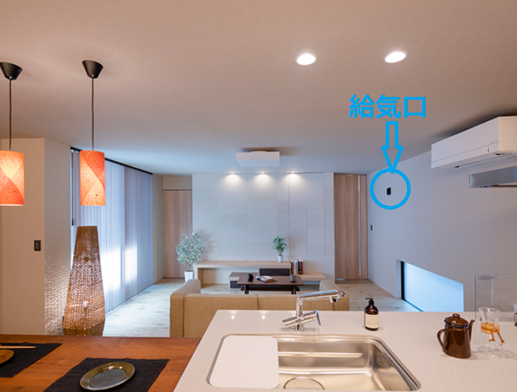 (自然に外気を取り入れる吸気口からトイレ、洗面室に設けた換気扇から常時換気し続ける)