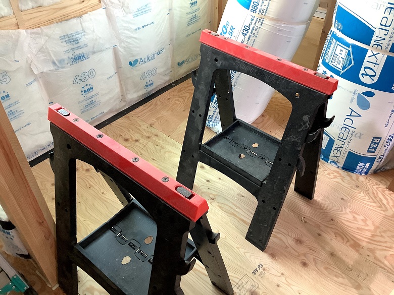 手の届かない作業をする時に、4本脚の台に乗って作業します。