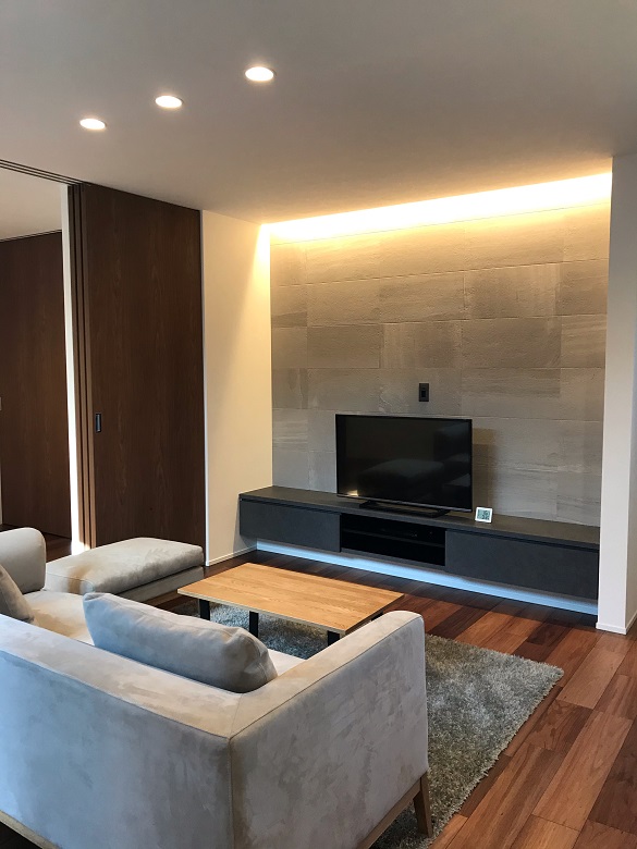 ⑧テレビ台の背面には、タイルと間接照明で雰囲気を。