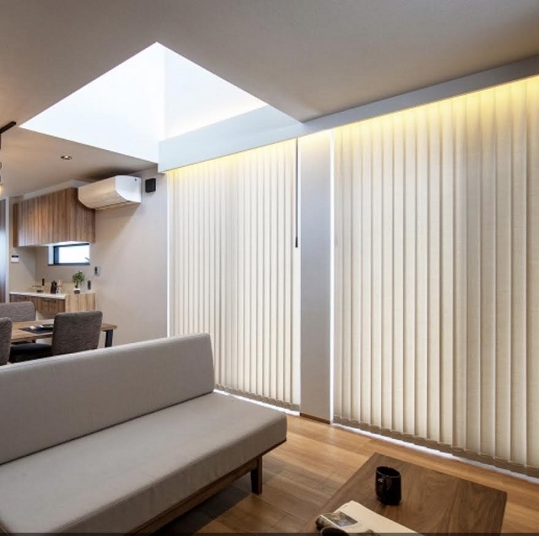 ブラインドを閉めた際に照らされた光が伸びてリビング空間とこだわりのカーテンを素敵に演出する事が出来ます。
