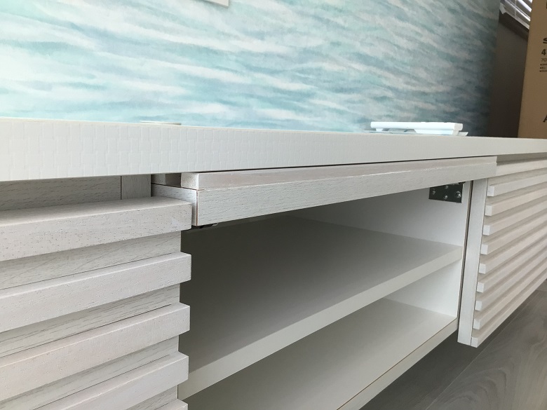 センターの扉が下から上に開閉し、テレビ台本体の中へインセット出来る仕様。