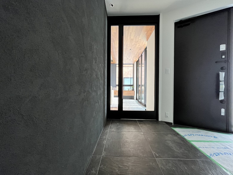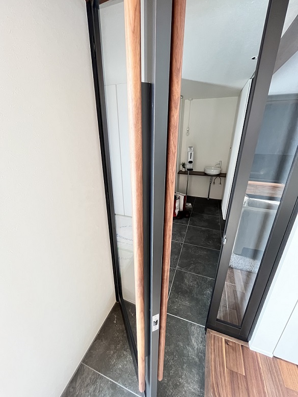 扉幅とガラス面を広く計画した片袖仕様の扉、黒いフレームが印象的。