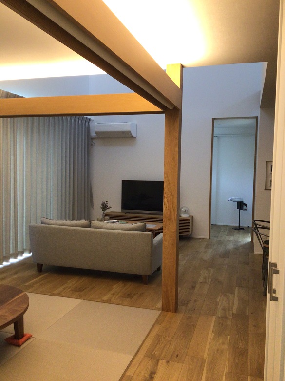 和室柱に合わせて木材の梁のように見せて製作した家具。