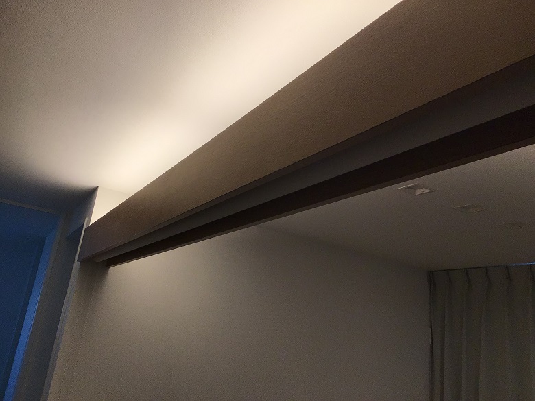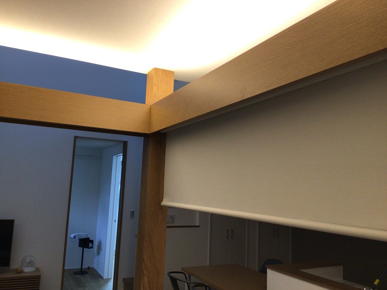 梁の中身はなんと、上に間接照明、下はお昼寝用のロールスクリーン。