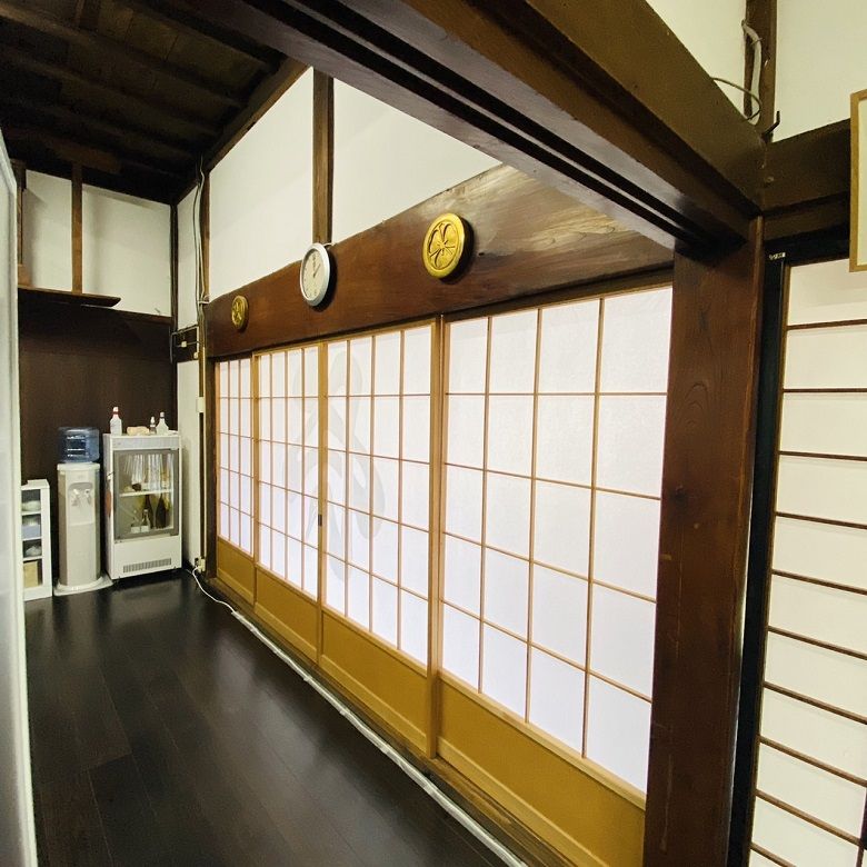 梁下の建具はオリジナルの透かし障子になっていて、玄関を開けたときに目を引きました。