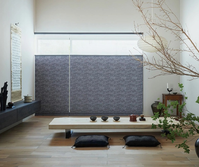蛇腹状(プリーツ)またはハニカム状の生地を上下に上げ下げして使用する建材です。