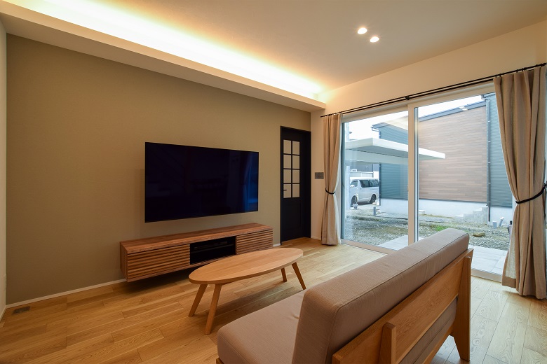 ナチュラルモダンなリビングに、天井高を活かした間接照明と、ダークカラーのドアとトグルスイッチでヴィンテージ感をプラスしました。