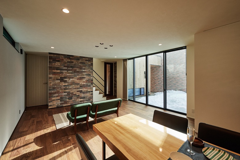 レンガの壁とウォルナットが調和したヴィンテージテイストの住まいです。