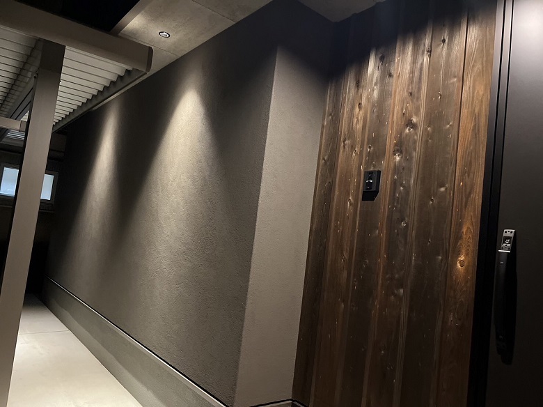 玄関ポーチ部分には、魚沼木材さんの「WL-UC wall」という本物の杉の木を塗装した外壁板を採用しています。