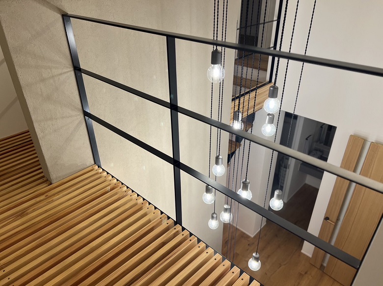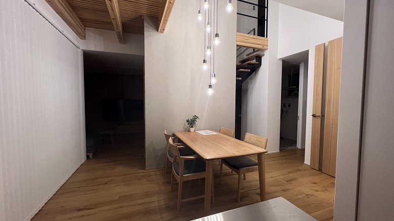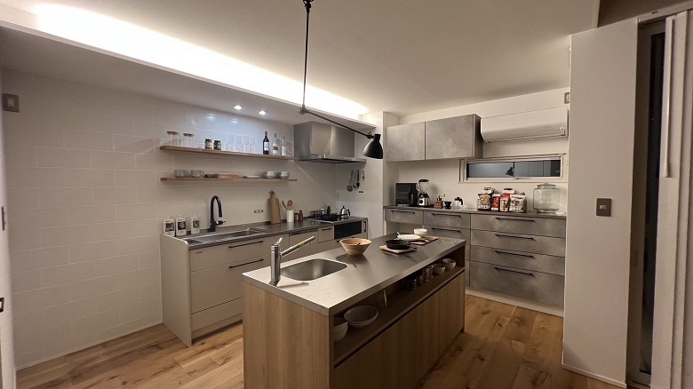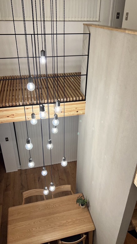 キッチンはダウンライトを使わず、間接照明と作業台の上にあるペンダントライトのみとなっておりますが、充分明るいです!