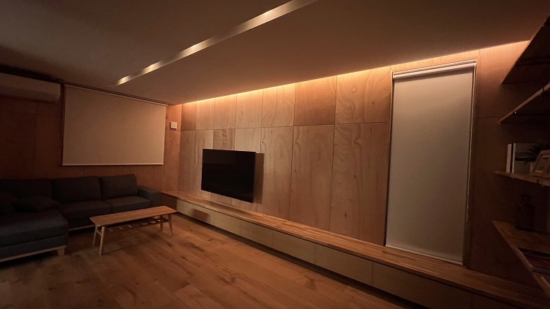 造作TVボード兼、ベンチ上部には全面間接照明を。