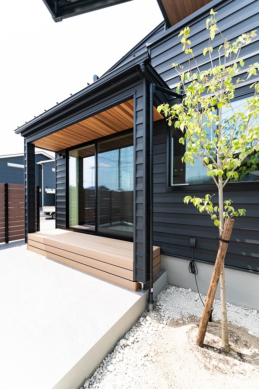 ウッドデッキに腰掛けながらシンボルツリーを眺められ、家族との時間を共有できます。