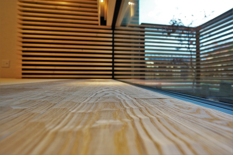 坪庭を眺める地窓の手前にはタモの床板を配置。