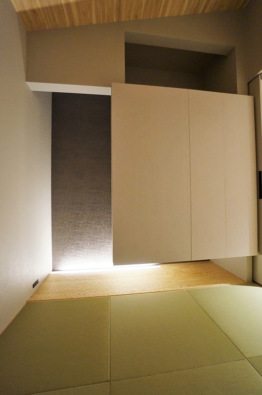 吊押入れの下に間接照明を配置することで、空間に奥行きが生まれる。