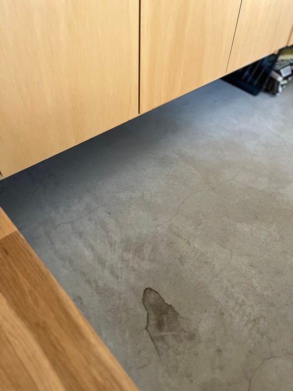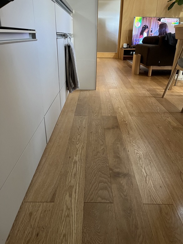 キッチン前の日光が当たらない部分は、水分のシミなどで少し濃い目に。