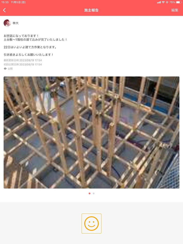 グループチャットには職方さんからの進捗報告も頂いています。