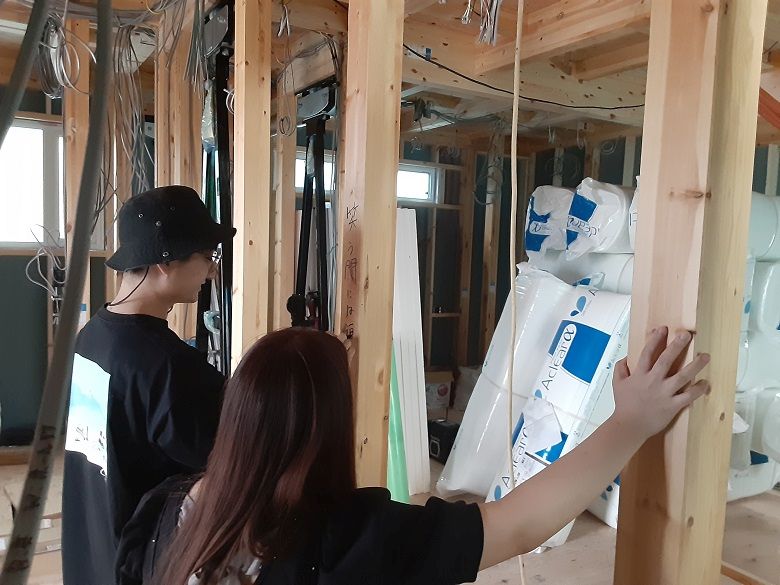 施工現場の柱や梁に、手形や好きな言葉を残しました!