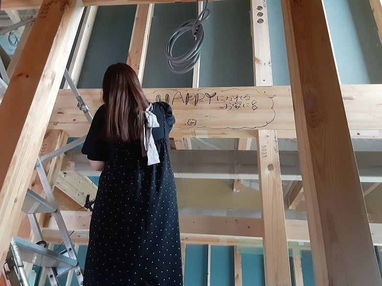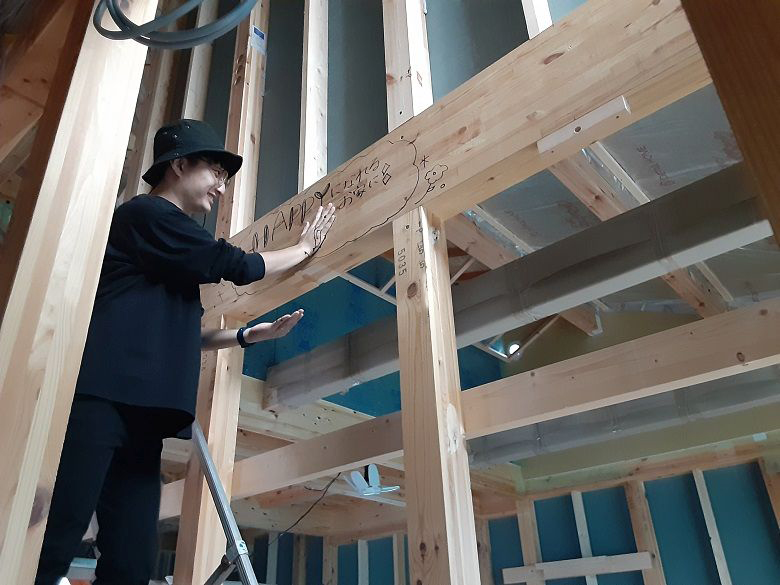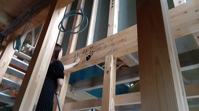 そしてお施主様から素敵なご提案をいただき、柱や梁に手形や好きな言葉を残しました!
