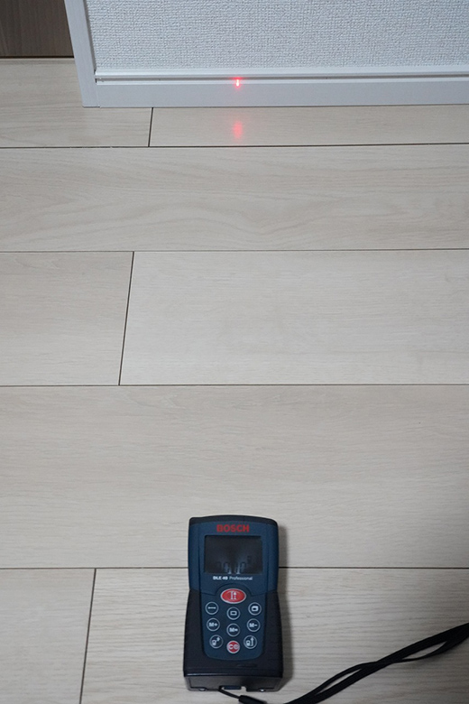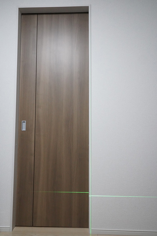 試しに私の住んでいる賃貸アパートの引き戸枠にレーザーラインを当ててみましたが……むむむ、上下で3mmくらい曲がっている……。