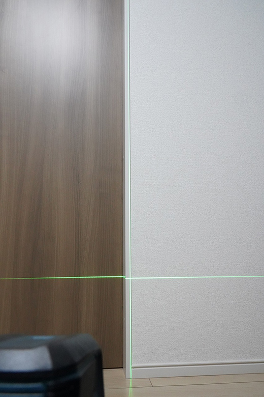 こちらはグリーンレーザーで、垂直と水平のラインが出るので、取り付けた棚や枠がまっすぐ施工されているかどうかを確認することができます。