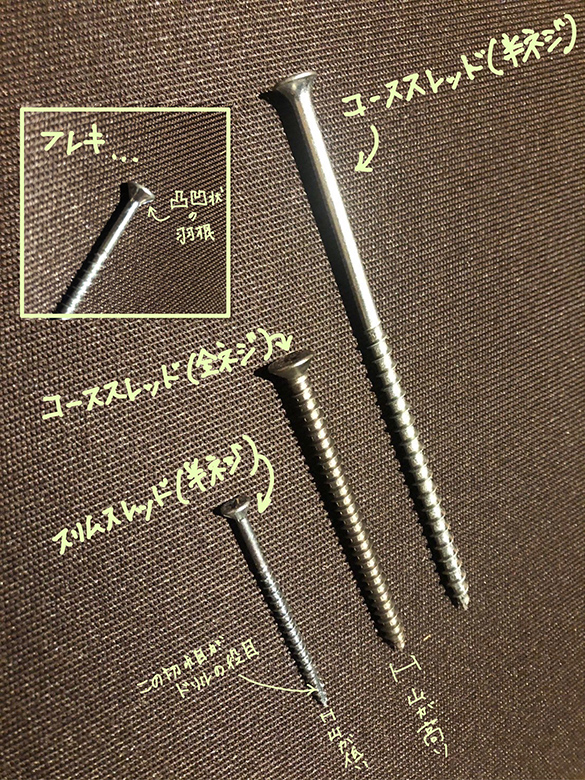 加えて!ビスの頭の部分に「フレキ」と呼ばれる凸凹が…コーススレッドはツルツルです。