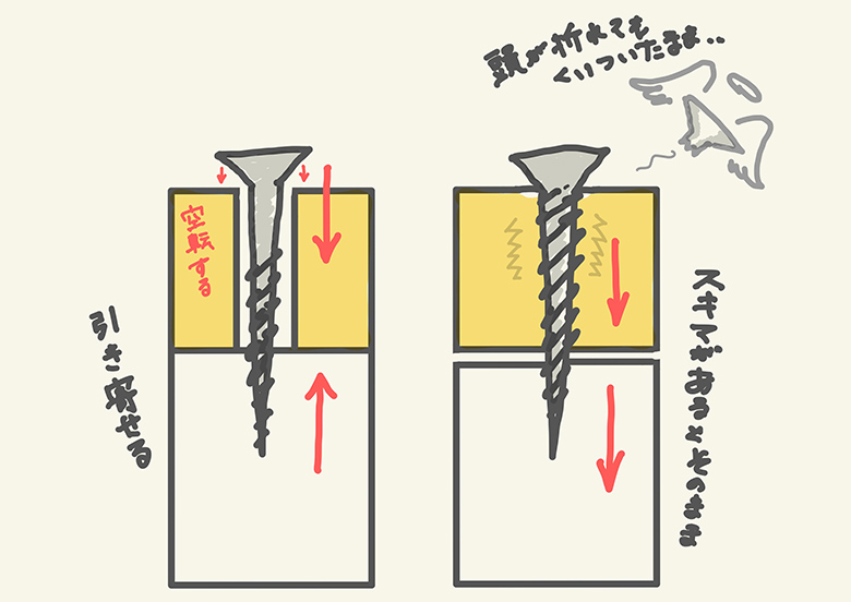首の部分が空転するのでビス先端が食い込めば食い込むほどビス頭に挟まれ、互いを引き寄せあう仕組みです。