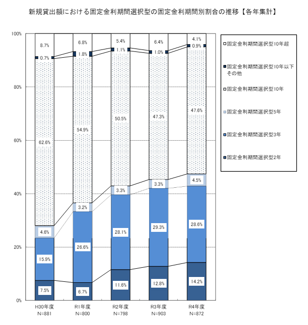 ★このデータからは、固定金利期間選択型ローンを利用した方の中で、およそ95%が10年以下の金利を選択しており、その中でも10年固定を選択した方が、およそ半数いることが判ります。