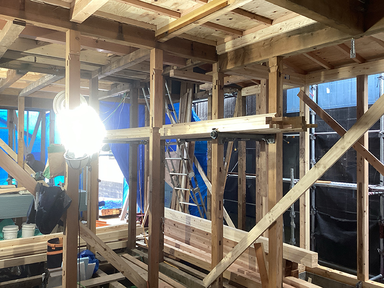 現在、木工事にて構造の補強金物の取り付けや外周部の面材を施工しております。