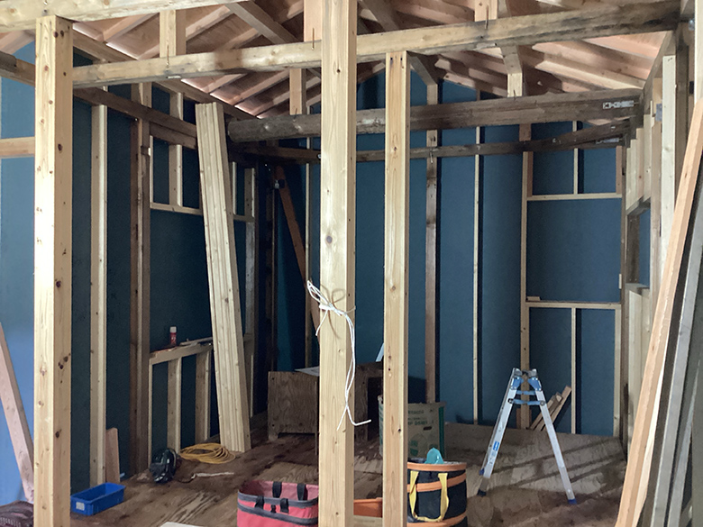もともとあった土台、柱、梁から補強を行い大工さんの職人の技により傾いた床や壁を違和感が無いほどに調整を行っていくので、職人さんの技術には頭が上がりません。
