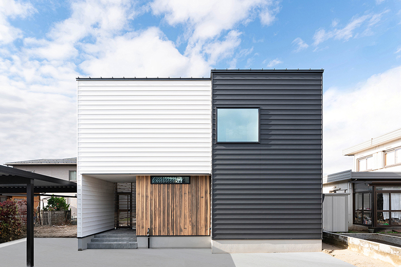 白と黒のガルバリウム鋼板をベースに、縦張りの杉板でアクセントを付けた外観。