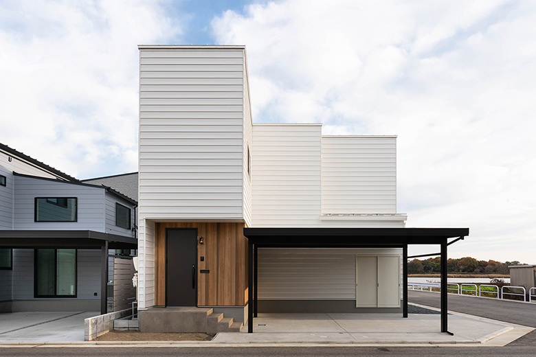 明るさを感じさせる白のガルバリウム鋼板と、エッジの効いた箱型のフォルムが印象的な外観。