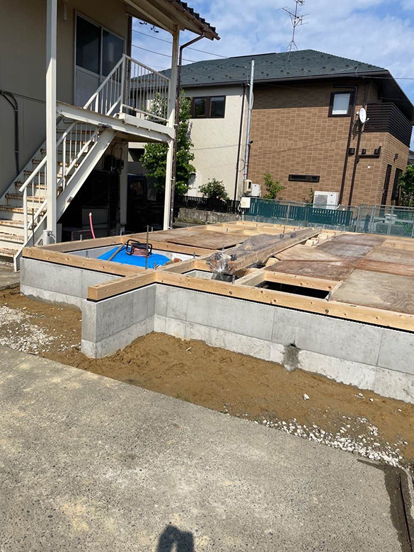 上棟前は基礎と土台のみの状態となります。