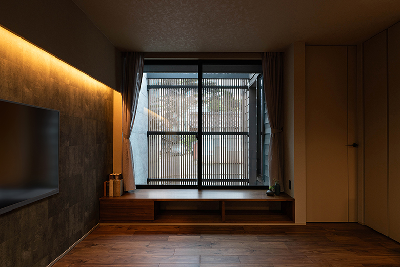 建物のアクセントにもなっているアルミ格子ですが、実はタイルテラスからの目隠しにもなっています!