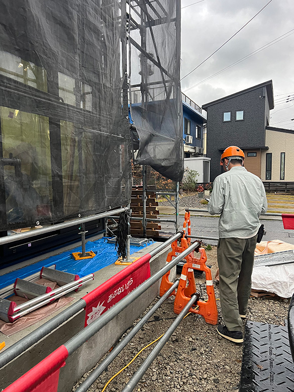 外周部は現場で使う資材などおいていることが多い為、資材が雨に濡れないように保管をしているか、施主様が見学に来られた際に建物までの通路に危険がないかなどを確認しております。