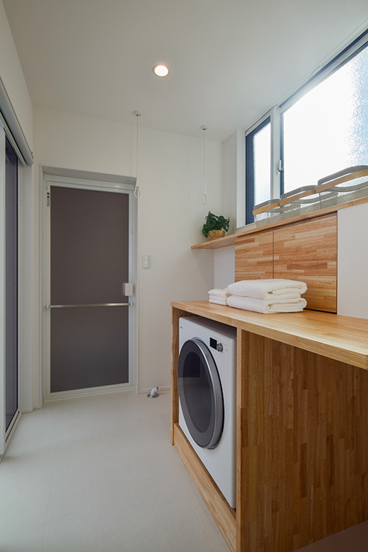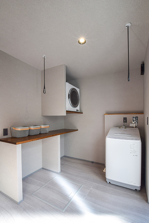 乾燥機や洗濯機置き場にフィットするよう設計された造作のカウンターが、日々の家事を楽にしてくれます。